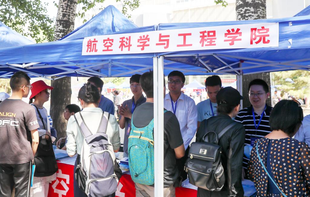 活动期间,北航“冯如杯”竞赛学生优秀科技创新作品也在现场展示,吸引高考考生及家长驻足观看;广场大屏幕上播放着《今日北航》宣传片,并对招生政策宣讲会进行了实时直播;学院路校区图书馆、航空航天博物馆、校史馆、部分实验室以及沙河校区面向广大考生和家长开放,使考生和家长近距离地感受了北航的学习、科研、生活环境和浓郁的校园文化氛围。